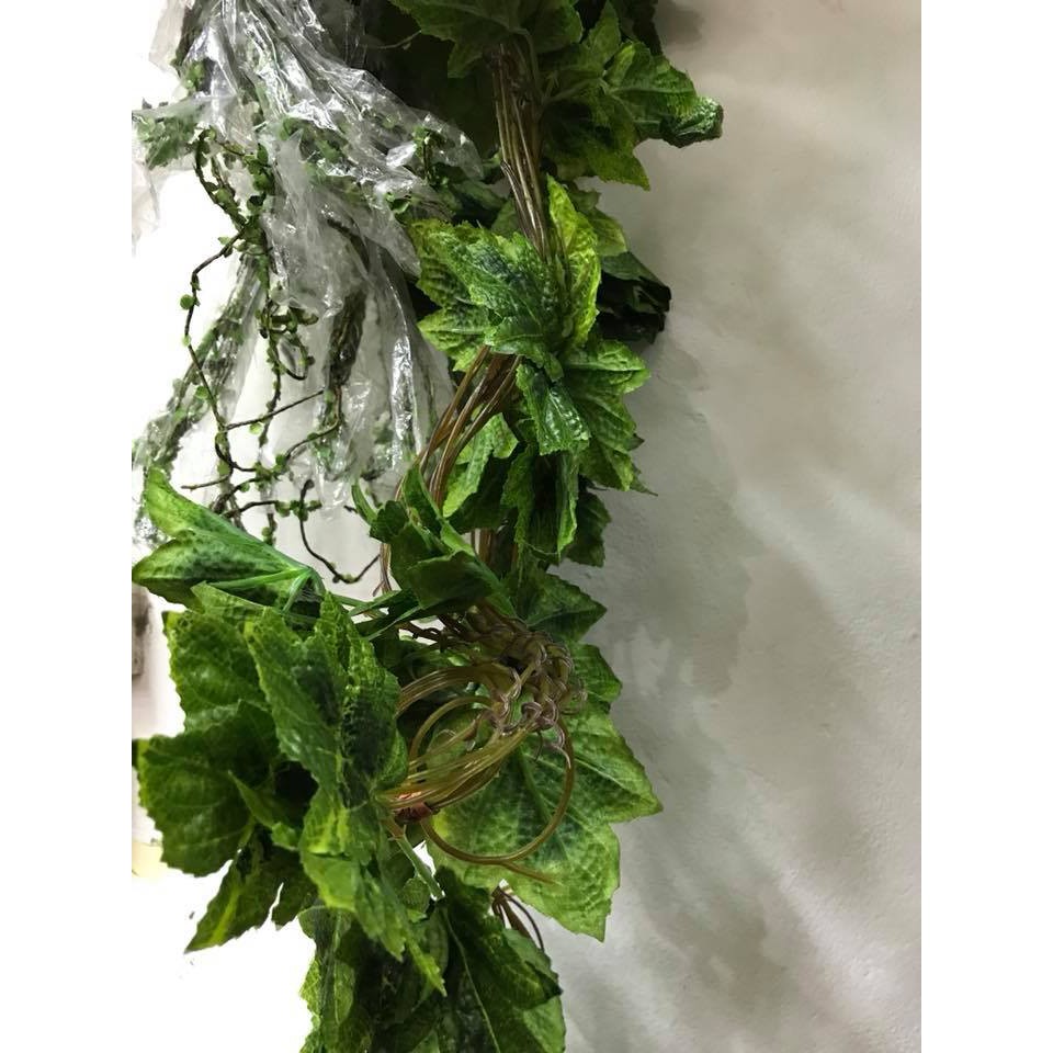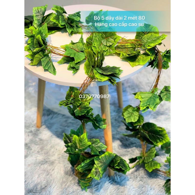 Bộ dây lá nho dài 2m80 (gồm 5 dây), hình chụp thể hiện 1 bộ 5 dây; màu xanh lá cây; chất liệu: nhựa, vải; trang trí leo dàn, leo tường, leo rào, cây…Giá trên là của 1 bộ 5 dây