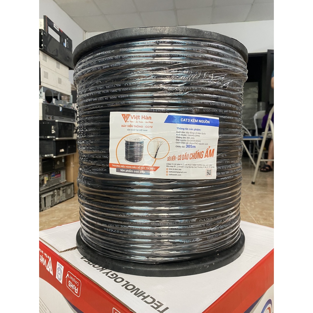 Dây mạng CAT3 kèm nguồn 25AWG đồng nguyên chất, cuộn 305m, nhựa PVCDây điện thoại 4 lõi kèm nguồn Việt Hàn hay còn có tên gọi khác là cáp mạng CAT3 kèm nguồn. Dây điện thoại 4 lõi được có nguồn được sản xuất tại nhà máy Việt Hàn ở Ba Vì, Hà Nội, Việt Nam.