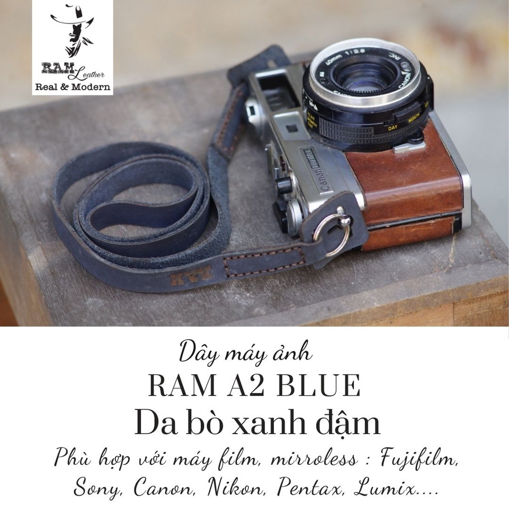Giới thiệu Dây máy ảnh da bò thật handmade bền chắc cực đẹp xanh dương RAM Leather a2