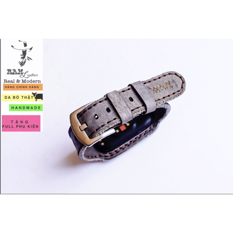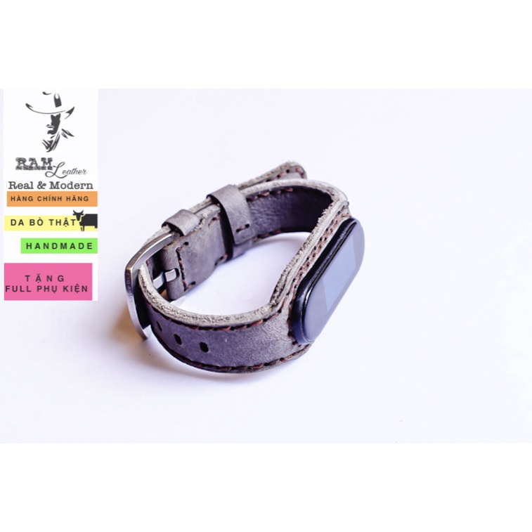 Dây miband da bò thật handmade cao cấp cho miband 3 , miband 4 , miband 5, miband 6 da bò xám quân đội đức - RAM Leather