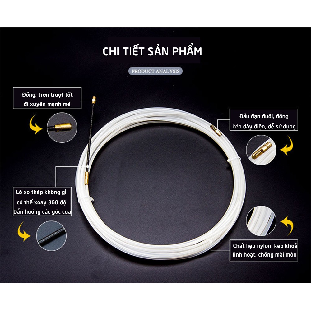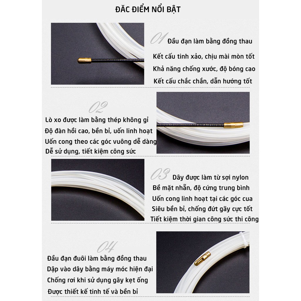- Dây mồi chuyên dụng để luồn dây điện qua ống gen tròn, ống ruột gà có nhiều đường gấp khúc