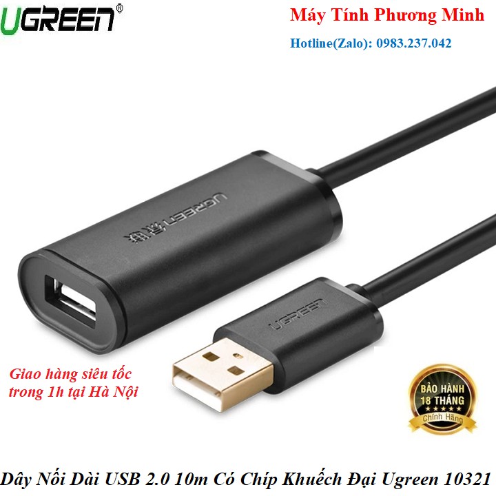 - Cáp Nối Dài 10M USB 2.0 Ugreen 10321 Có Chip Khuếch Đại Cao Cấp là sợi cáp cao cấp chính hãng cung cấp giải pháp hoàn hảo để nối dài cổng USB 2.0 từ máy tính, laptop, đầu ghi hình camera... của bạn thêm chiều dài 10M dùng để kết nối các thiết bị ngoại vi như chuột, bàn phím, máy in, máy quét, bộ điều hợp mạng 3G, loa và các thiết bị ngoại vi máy tính cổng USB khác... với tín hiệu được truyền tải ổn định và nhanh chóng.