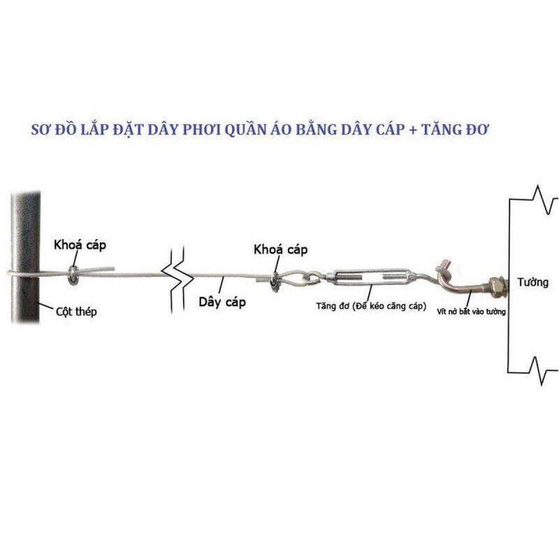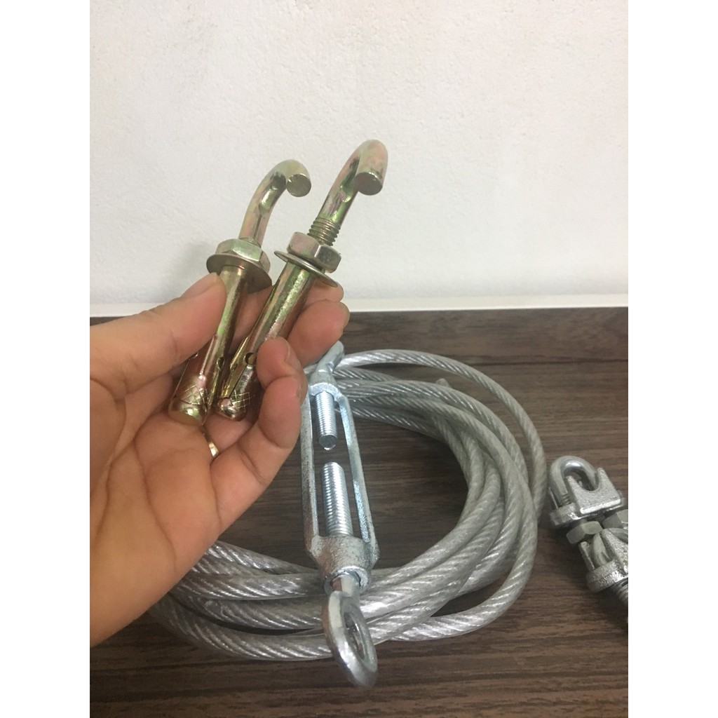 - Dây Phơi quần áo - Dây cáp thép phơi đồ - Phi 5mm chiều dài từ 3m đến 10 theo từng bộ cụ thể + Tặng kèm 2 khóa cáp 8, 2 nở móc sắt M8 và 1 tăng đơ M8.