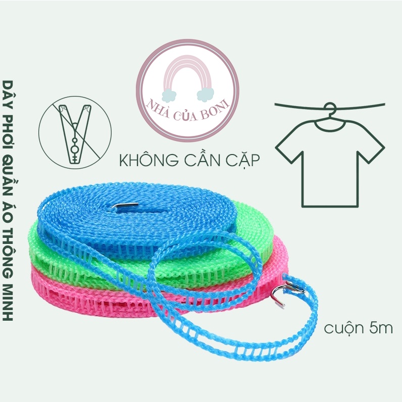 - Dây phơi quần áo thông minh giúp cố định các móc quần áo khi phơi tránh bị gió thổi dồn gây ẩm ướt và lâu khô.