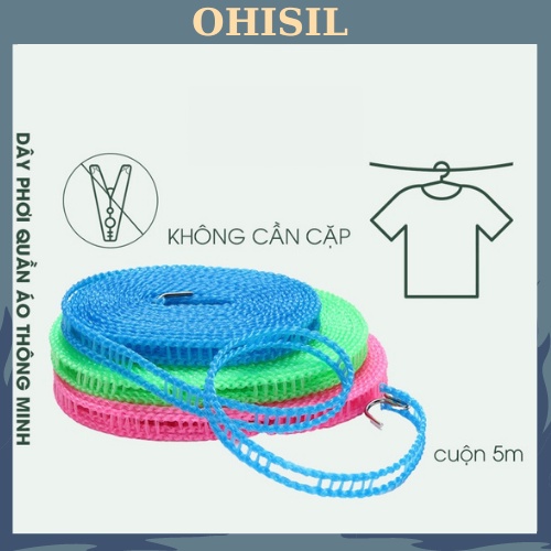 Tên Sản Phẩm : Dây Phơi Quần Áo OHISIL Dây Phơi Đồ Thông Minh Dài 5m Không Cần CặpGiặt giũ, phơi quần áo là công việc quen thuộc của các bà nội trợ. Công việc tưởng chừng đơn giản này cũng thường gặp phải những trở ngại như: dây phơi bị đứt do không chắc chắn, gió thổi khiến quần áo bị xô vào gần nhau khiến chúng lâu khô và có mùi khó chịu..