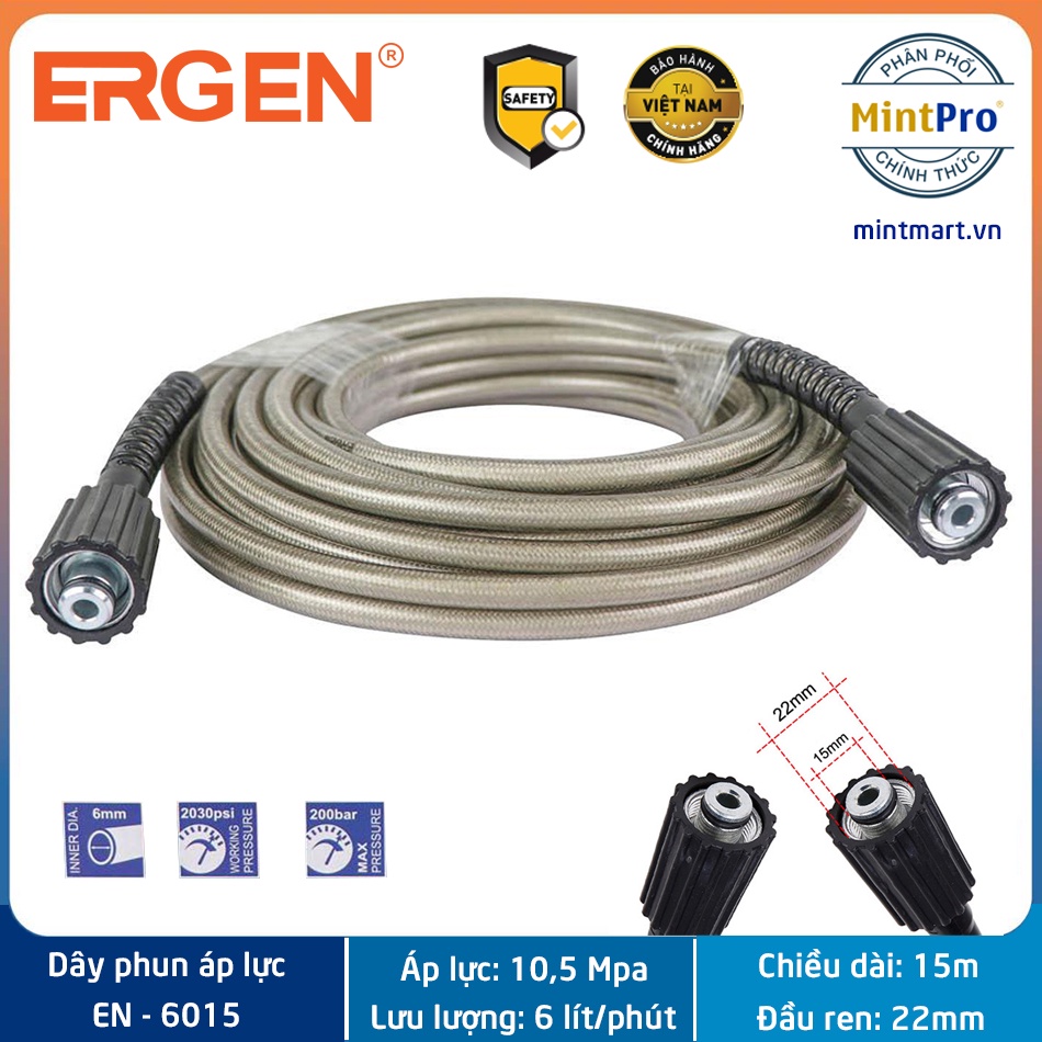 Dây phun áp lực Ergen cho máy rửa xe là phụ kiện đi kèm chuyên dụng cho các dòng máy rửa xe hiện có trên thị trường có đầu kết nối là ren 22mm tiêu chuẩn.