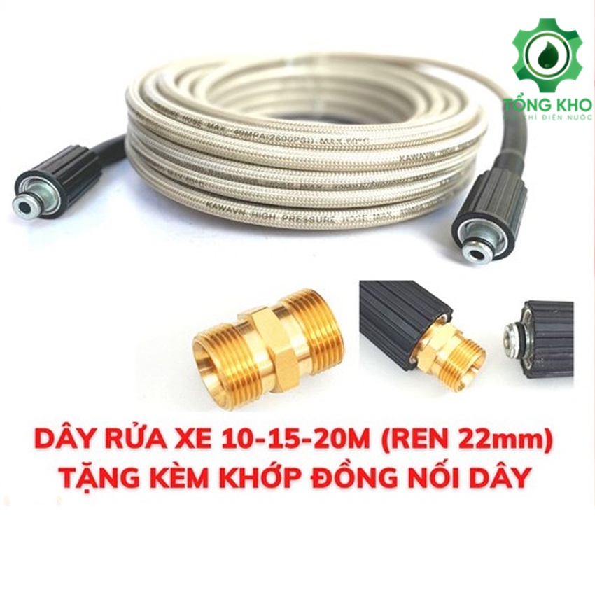 - Dây rửa xe, dây rửa xe áp lực cao, dây áp lực máy rửa xe.Tặng kèm kép 22mm ( khớp đồng) nối dây