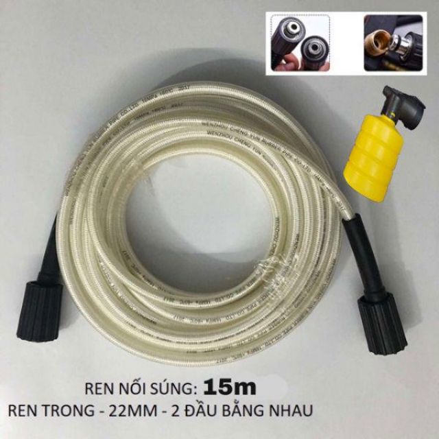 Dây rửa xe, vệ sinh cho máy bơm xịt rửa áp lực cao - tặng kèm bình xà bông tạo bọt tuyếtCông dụng : Dùng để dẫn nước thiết bị phun tưới, lắp cho các máy phun áp lực cao sử dụng trong Nông nghiệp, công nghiệp và gia đình. - Gắn cố định vào thiết bị phun tưới, máy phun áp lực khi sử dung. - Bảo quản nơi khô thoáng, tránh để nơi có nhiều dầu mỡ. Thông số kỹ thuật: - Chất liệu : nhựa/bố/ lõi chịu lực - Chịu áp lực cao - Chiều dài : 15m - Ren gắn: Ren 22mm ( lắp ren súng 22mm ) - 2 đầu to bằng nhau - Thích hợp lắp : Máy bơm cao áp, máy xịt rửa áp lực cao