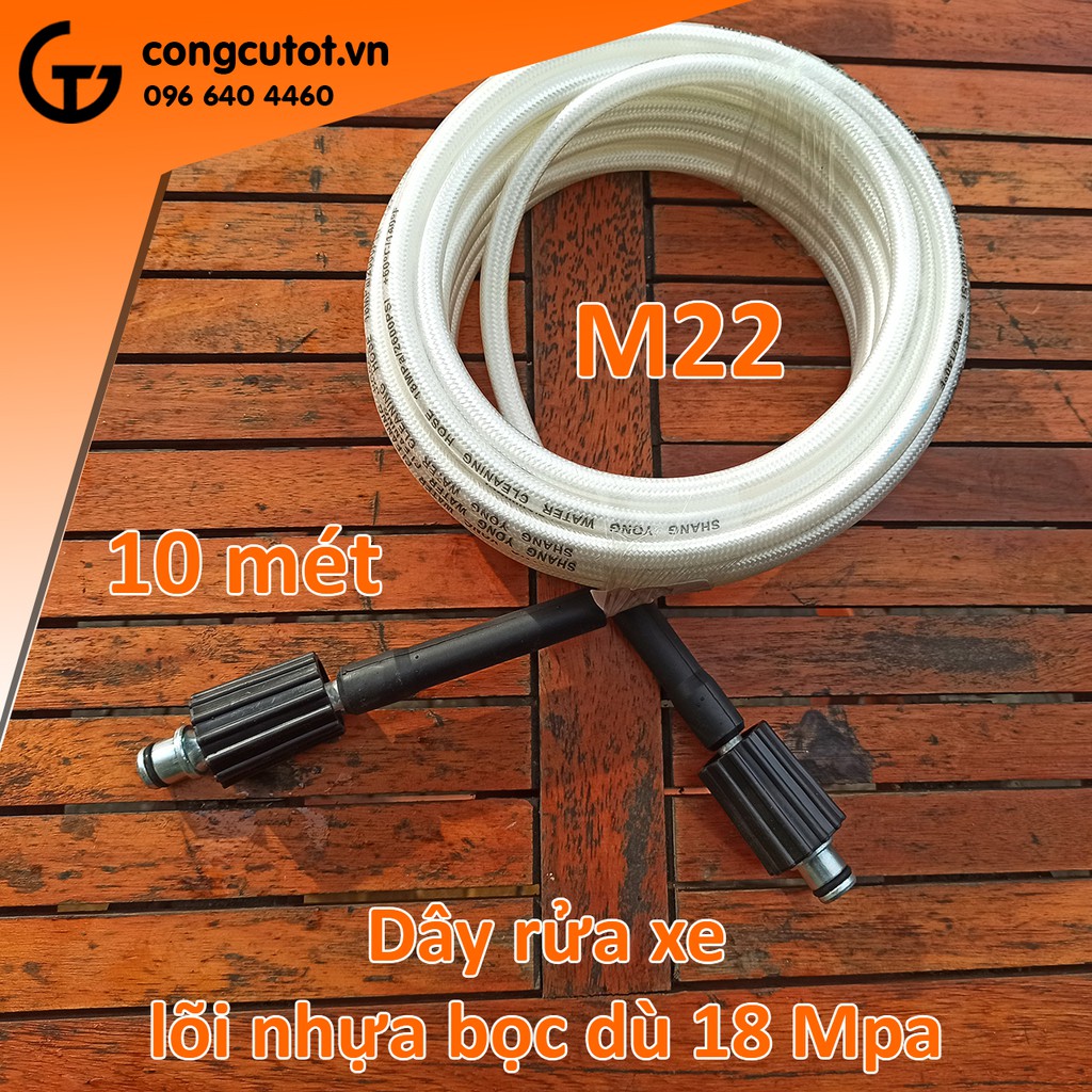 Dây rửa xe áp lực 18MPa 10m, lõi nhựa bọc dù trắng, hai đầu ren trong to M22