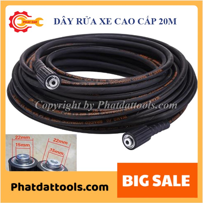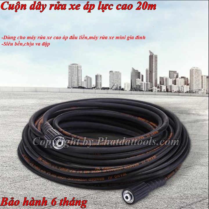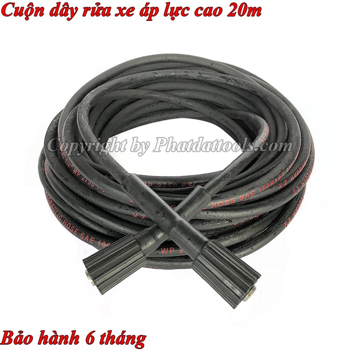 Cuộn dây rửa xe 20m chuyên dụng lắp cho máy rửa xe cao áp gia đình,máy rửa xe đầu liền.Thông thường,khi mua máy đi kèm cuộn dây cao áp có chiều dài khoảng 8m-10m,trong quá trình sử dụng bị hư hỏng hoặc dây quá ngắn không phù hợp với yêu cầu công việc như xịt rửa sân vườn,rửa xe ở xa nguồn nước,nguồn điện thì việc nối dài dây cho máy rửa xe là vô cùng tiện dụng.Cuộn dây rửa xe 20m với bố thép bọc lõi cho độ bền cao,chịu va đập,chịu ma sát cực tốt,chiều dài đủ 20m,có thể nối dài thêm với dây rửa xe cũ bằng kép đồng ren 22 tặng kèm.