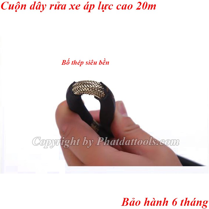 Cuộn dây rửa xe 20m được sản xuất bằng công nghệ hiện đại,khả năng chịu áp cao lên đến 2750 PSI tương đương 190 Bar (thông thường máy rửa xe mini gia đình cho áp tối đa đến 120Bar).Đầu cos ép thủy lực bền bỉ,không bục vỡ trong quá trình sử dụng.