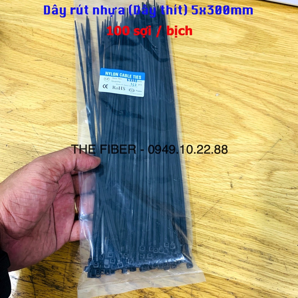 Dây rút nhựa (Dây thít) 5x300mm 100 sợi/bịch - Màu trắng/đenDây rút nhựa , dây thít nhựa gồm một đầu khóa và một đoạn nhựa với nhiều mắc khóa trải dài từ đầu khóa xuống dưới chui cắm. Bộ phận lưỡi gà giúp gài chặt dây, ở một số loại dây rút, bộ phận này được thiết kế dài hơn để khi dùng tay lật lại có thể tháo ra được.