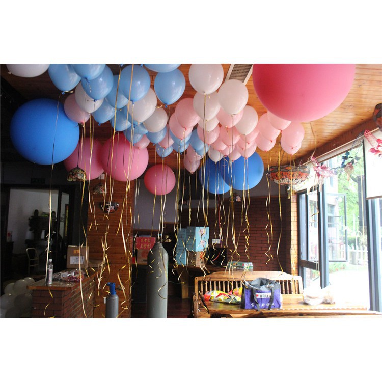 Cách trang trí bóng thả trần nhà: sau khi bơm bóng, buộc ruy băng vào đôi bóng, sau đó dám bóng lên trần bằng keo dính bóng chuyên dụng,