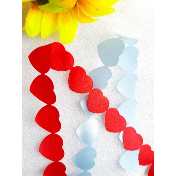 dây ruy băng được cắt lazer hình trái tim siêu xinh xắn luôn nhé, dùng viền trong may mặc hoặc trang trí tiệc, kích thước mỗi hình trái tim là 1.8cmx2cm. giá được tính cho 1m chiều dài nhaGiá RIVN