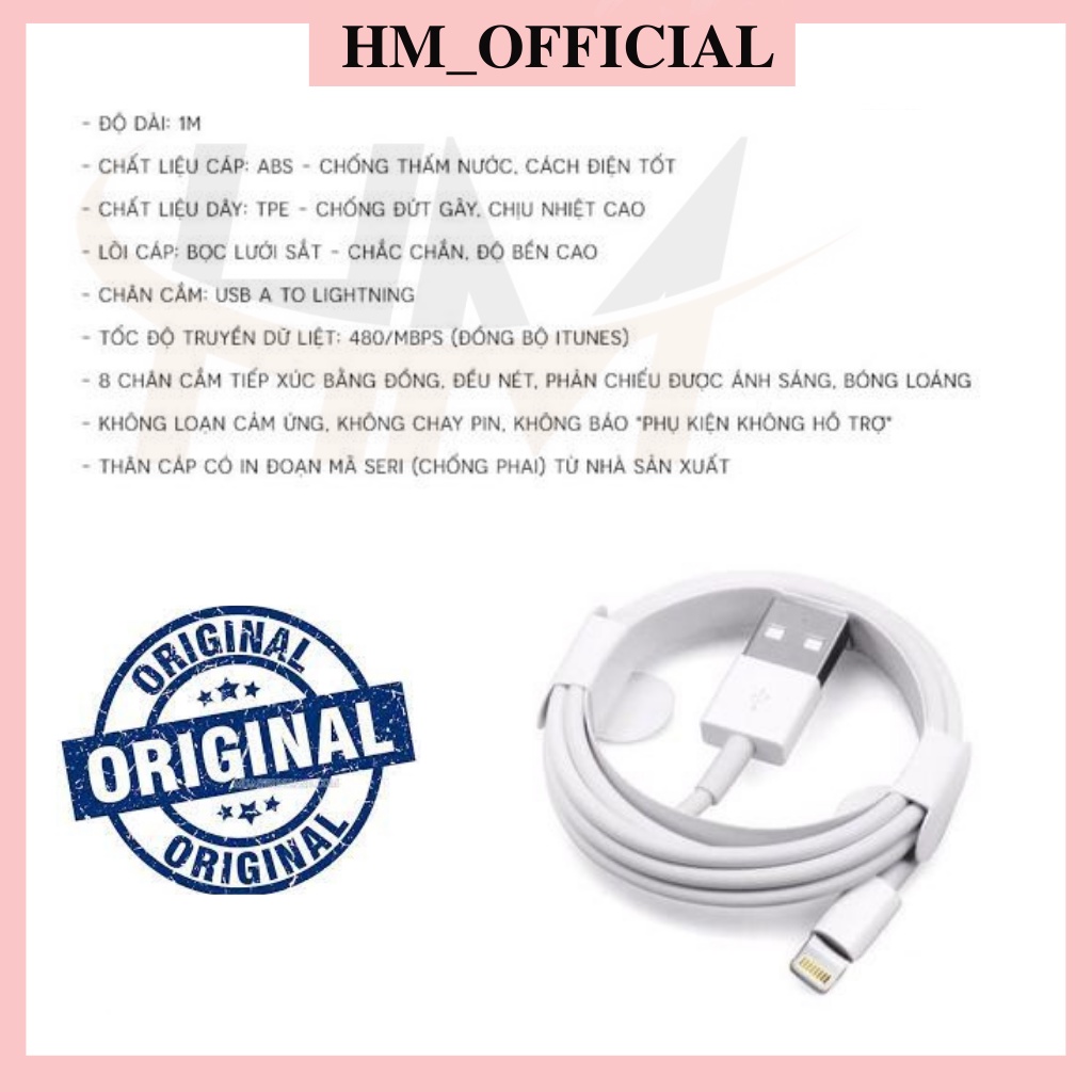 Cáp sạc iphone xịn được cung cấp theo tiêu chuẩn của apple, đem lại nguồn sạc ổn định, đảm bảo cho cái iphone của bạn, sắc nét trên từng chi tiết, đảm bảo an toàn tuyệt đối.