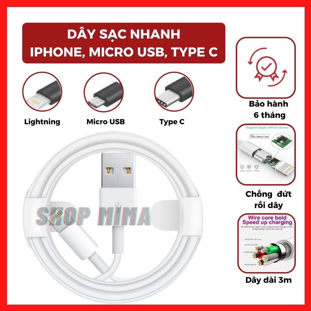 Dây sạc iphone/ samsung/type C/Micro USB - Cáp sạc iphone/ samsung/type C/Micro USB - Sạc nhanh-Ổn định-Bảo hàng 6 thángMima đảm bảo: