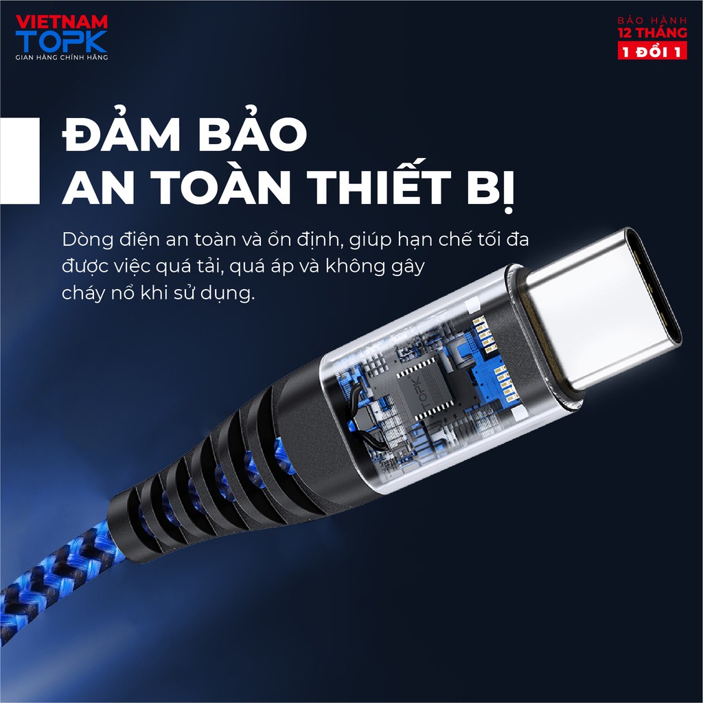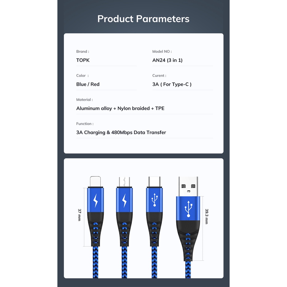 Giới thiệu Dây sạc nhanh 3A 3 trong 1 (Lightning, Type-C, Micro) vỏ bên nylon TOPK AN24-3 dài 1.2m - Hàng chính hãng