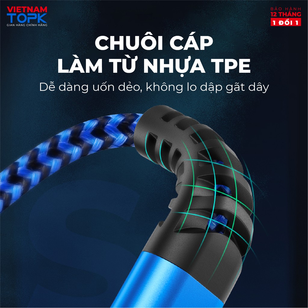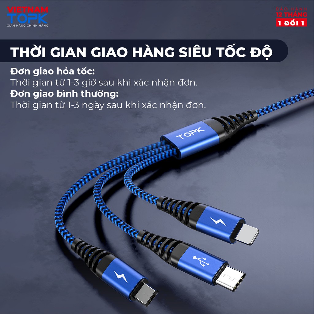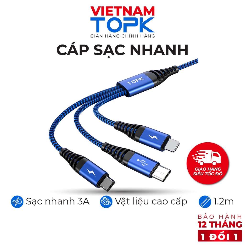 Điện Thoại & Phụ Kiện > Phụ kiện > Cáp, sạc & bộ chuyển đổi > Cáp & Bộ chuyển đổi di động || Dây sạc nhanh 3A 3 trong 1 (Lightning, Type-C, Micro) vỏ bên nylon TOPK AN24-3 dài 1.2m - Hàng chính hãngCòn hàng