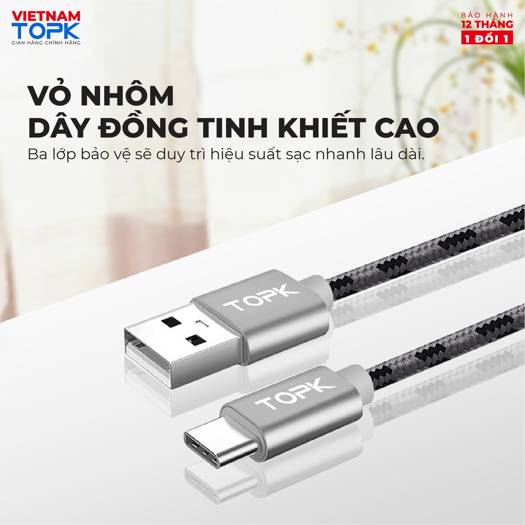 Dây sạc nhanh 3A TOPK AN09 vỏ bện nylon dài 1m - Hàng chính hãng Bảo hành 12 tháng 1 đổi 1