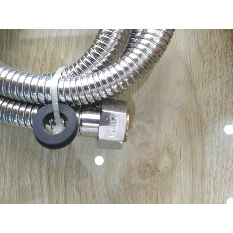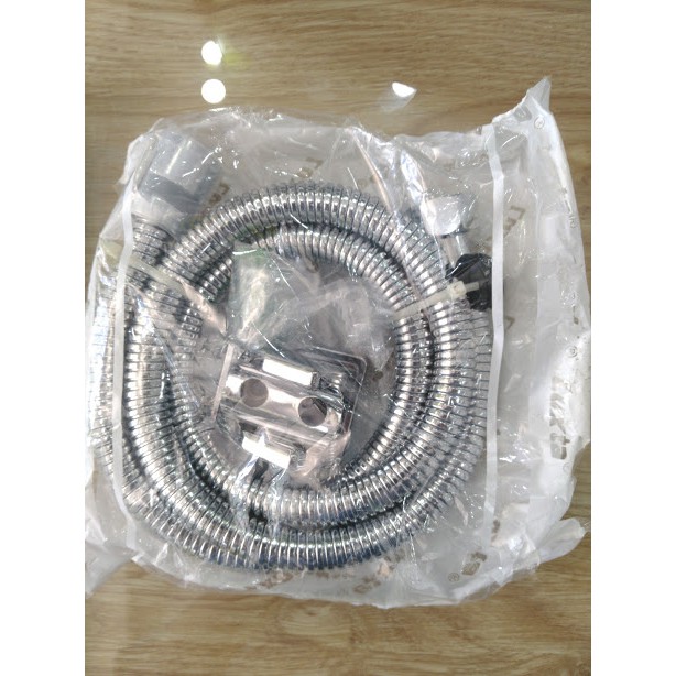 >Dây inox 150cm với ruột được bọc bố dù siêu bền, chịu áp lực cao, bát gác tay sen bằng ABS mạ Chrome.