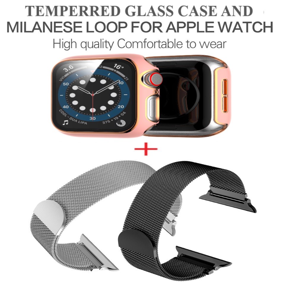 Dây Thép Milanese Apple Watch + Ốp Kính Cường Lực Viền Vàng Apple Watch Series 7/6/5/SE/4/3/2/1 Size 38-40-41-42-44-45