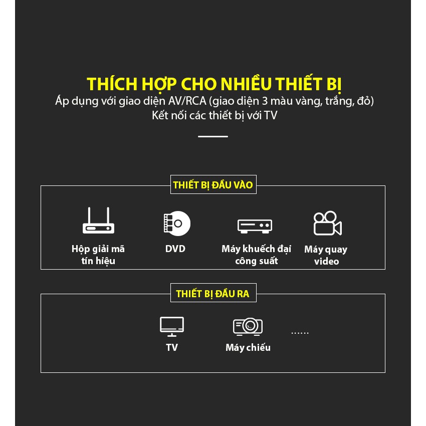 + Cáp chuyên dùng để kết nối từ cổng âm thanh loa AV / RCA của máy tính, điện thoại và tất cả thiết bị phát âm thanh sang loa, âm ly hoặc 1 số thiết bị chuyên dụng khác qua cổng AV / RCA