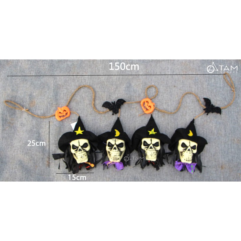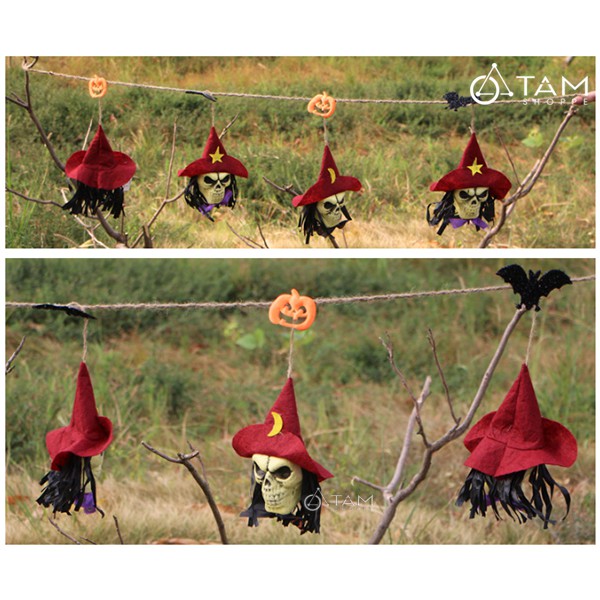 Dây treo trang trí Halloween là một trong những vật dụng trang trí treo tường, trần nhà ấn tượng. Dây treo gồm 4 phù thủy đầu lâu hắc ám được làm bằng mốt và vải nỉ, treo trên dây thừng.Dây treo Halloween 4 phù thủy đầu lâu hung hãn, ấn tượng...