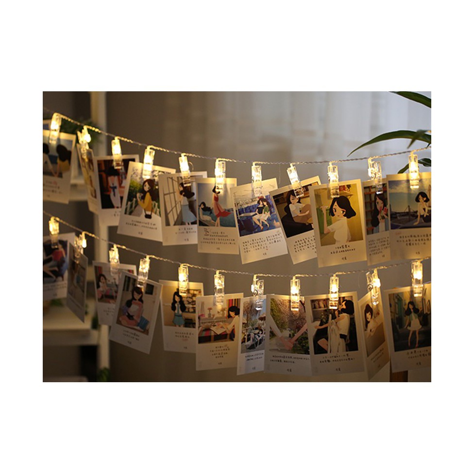 Bộ dây treo đã gồm kẹp ảnh. mỗi kẹp có gắn 1 đèn LED phát sáng ánh sáng vàng êm dịu, có thể sử dụng làm đèn ngủ, trang trí phòng, bàn tiệc cưới, bàn tiệc sinh nhật độc đaó.