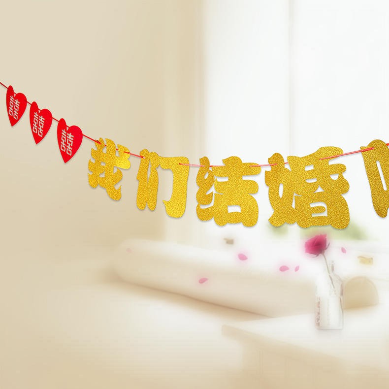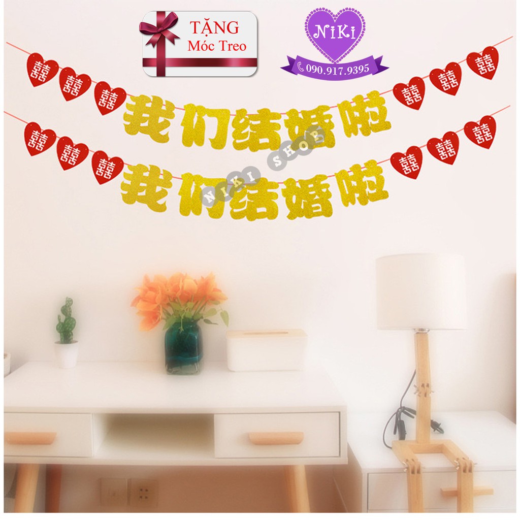 1 Dây Dài 3mét gồm :-6 chữ hỷ trái tim và 5 chữ Trung "CHÚNG TA ĐÁM CƯỚI NHÉ"