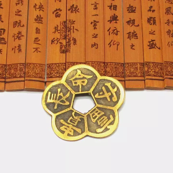 + Chất liệu và hoàn thiện: Tiền mai hoa 5 cánh từ hợp kim mạ đồng