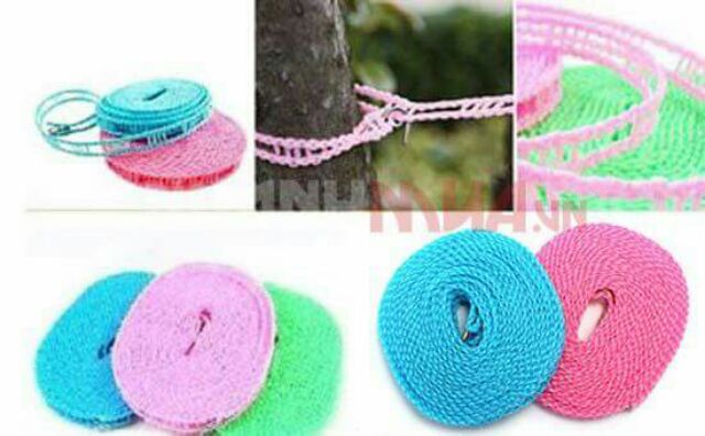 Dây treo quần áo rất tiện lợi,dài 5m,giữa các mắc có những đoạn hở để móc đươc mắc quần áo,k lo bị xô lệch như dây trơn khác, chất liệu như dây cuớc,bền mà chắc chắnGiá REAL