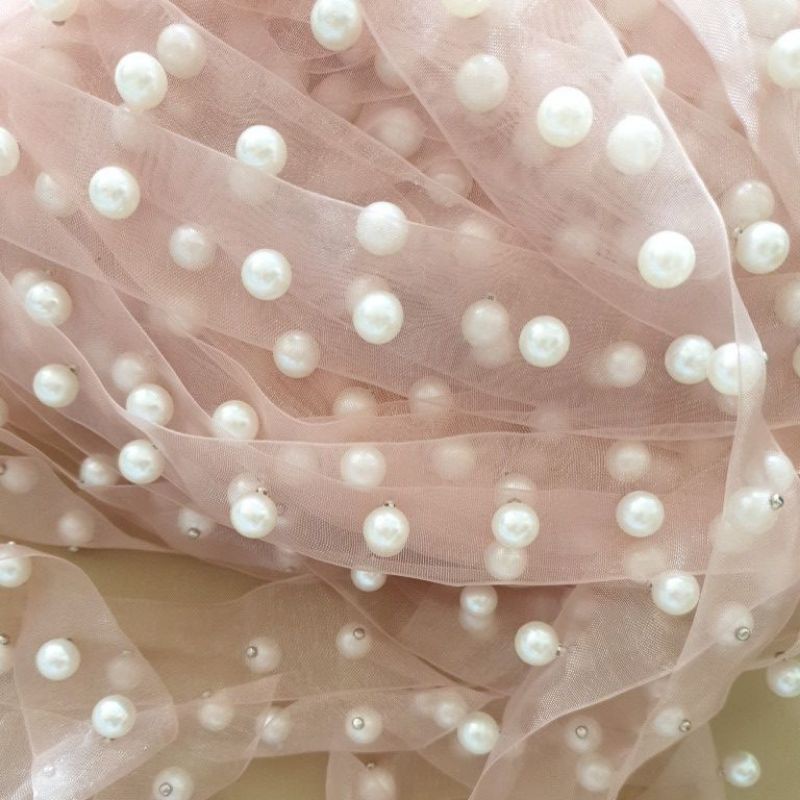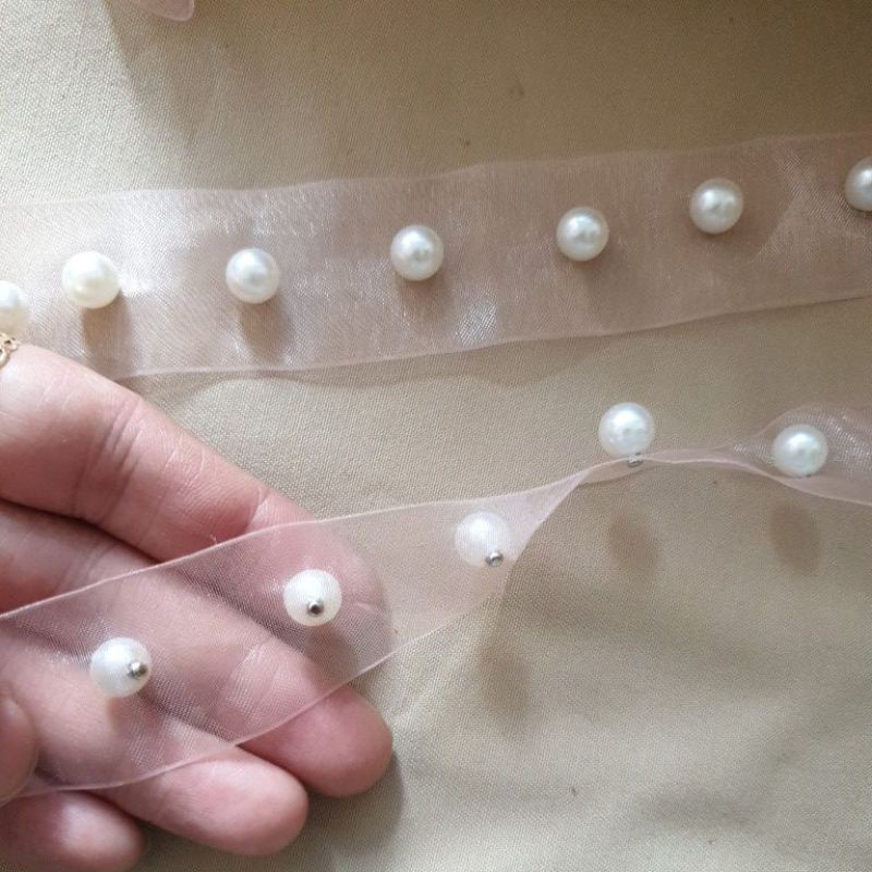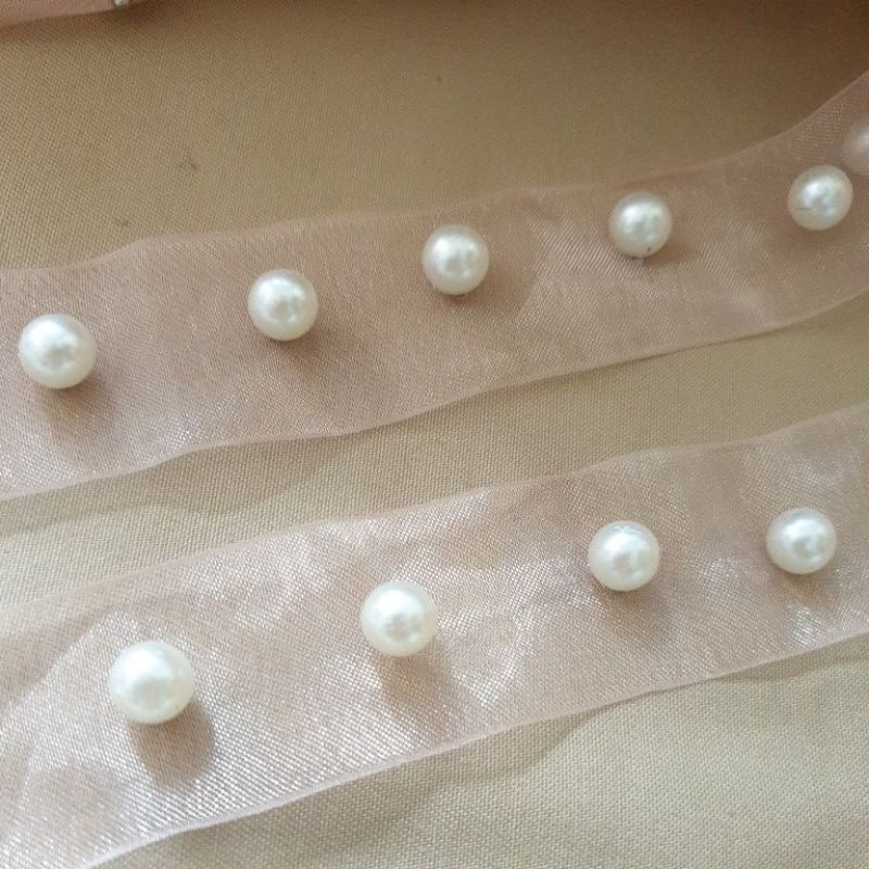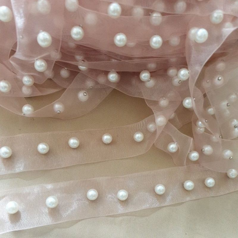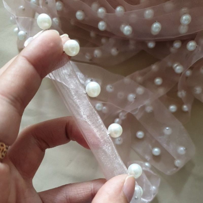 Dây viền trang trí chất voan kính hồng nude bản rộng 3,2cm, kết hạt trai trắng, hạt trai 8mmKhoảng cách giữa các hạt trai là 3cm