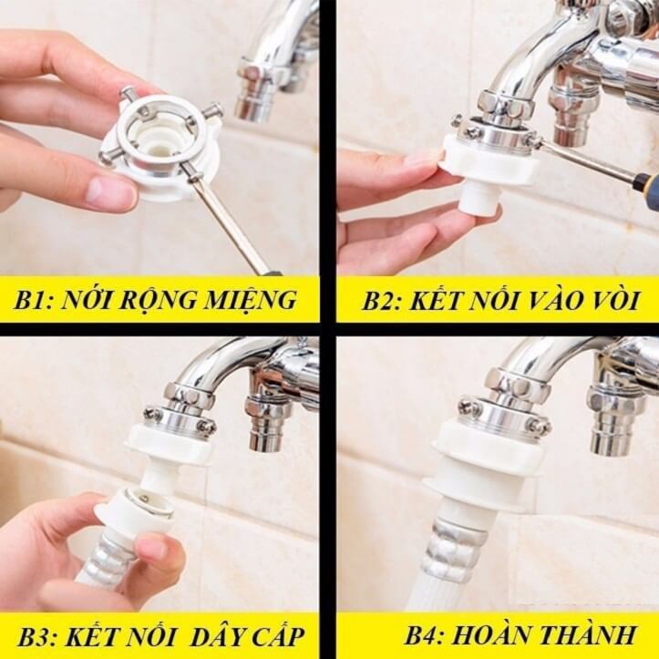 - Bạn chỉ cần vặn ốc vít của khớp nối sắt ra rồi gắn vô vòi nước và khóa ốc vít lại
