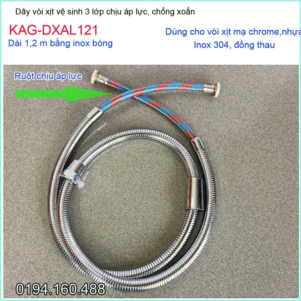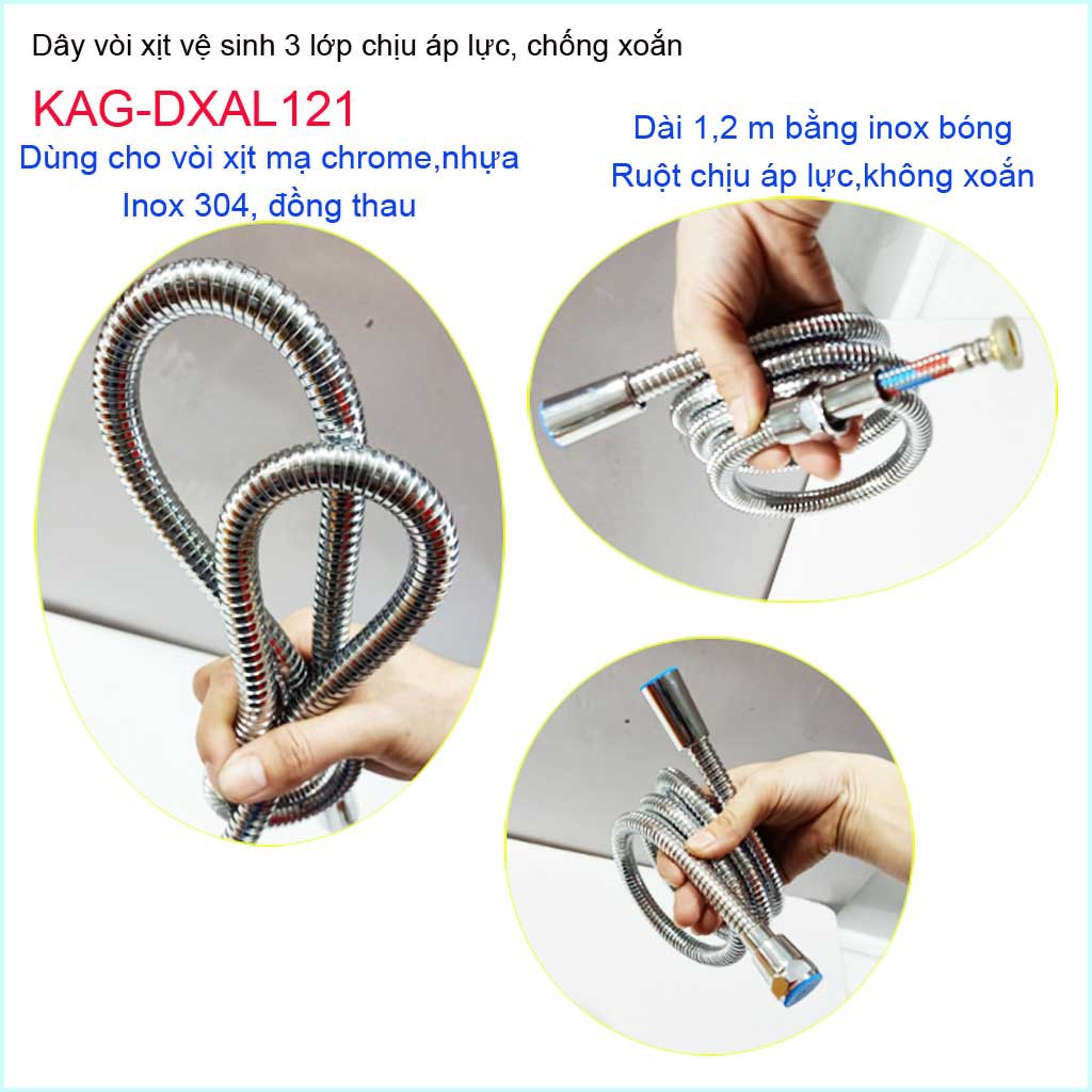 Dây vòi sen chịu nhiệt chịu áp 1.2m, dây vòi xịt, dây mềm cấp nước KAG-DXAL121Chất liệu: Dây vòi sen chịu nhiệt chịu áp 1.2m, dây vòi xịt, dây mềm cấp nước KAG-DXAL121 gồm 3 lớp inox bóng bên ngoài, lớp 2: cách nhiệt lớp 3: ruột nhựa mềm; Dây mềm, nhuyễn nên dễ dàng co giãn, chống xoắn khi sử dụng, cầm nhẹ tay, màu inox sang trọng phù hợp với các công trình cao cấp.