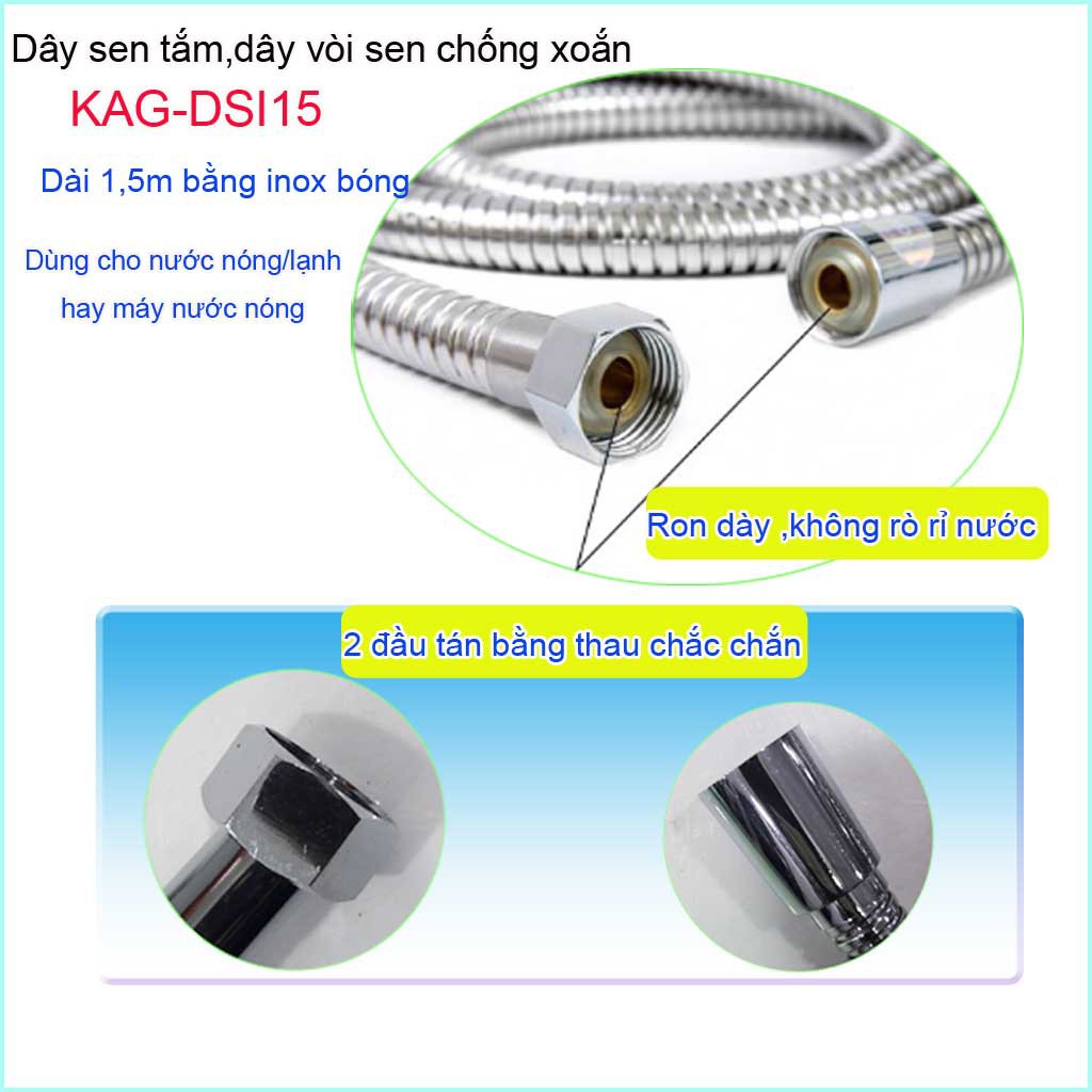 Dây vòi sen dài 1.5m Blanca, dây vòi tắm hoa sen- dây vòi xịt vệ sinh 1.5m, dây sen chống xoắn KAG-DSI15Chất liệu: Dây vòi sen 1.5m, dây vòi xịt, dây mềm cấp nước KAG-DI15 được bao bên ngoài lớp inox bóng, bên trong là ruột nhựa mềm nên dễ dàng co giãn, chống xoắn khi sử dụng, cầm nhẹ tay, màu inox sang trọng phù hợp với các công trình cao cấp.