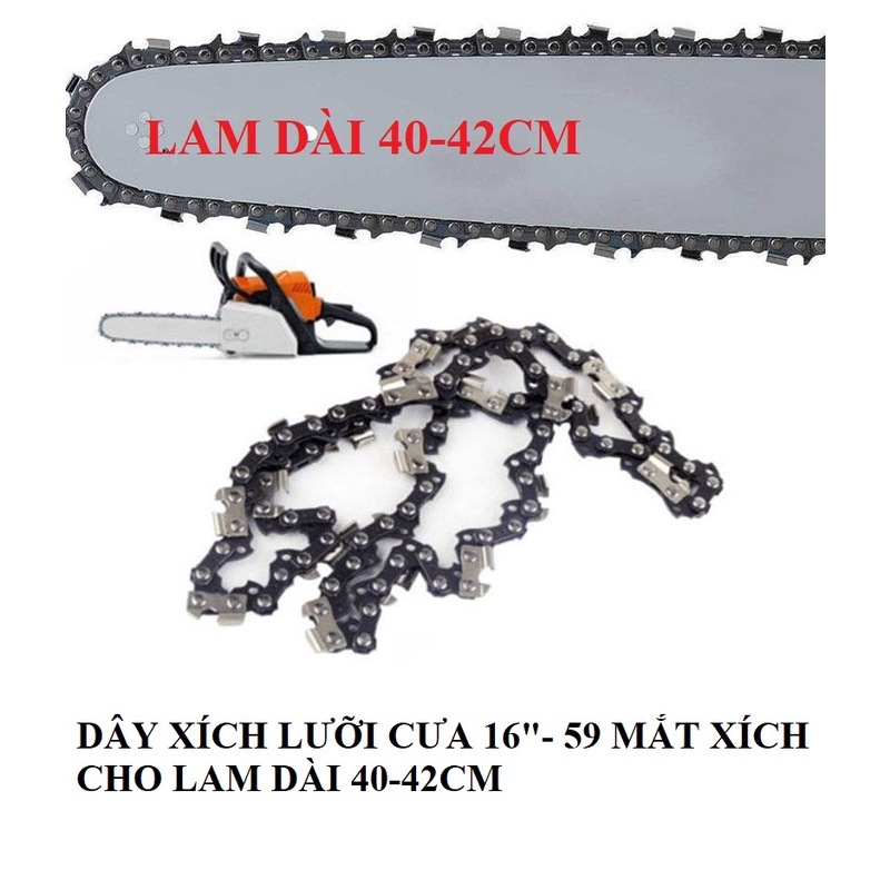 Dây Xích Cưa - Dây Cưa Xích - Sên Xích Cưa - Lưỡi Cưa Xích Thay Thế- Chất liệu : Hợp kim thép cứng- Dùng sơ cua thay thế cho các loại máy cưa chạy xăng, có chiều dài thanh lam từ 40-42cm- Dùng được cho các dòng máy cưa xăng : Stihl 021 , Makita 5016B, Husqvarna ...- Hàng Thái Lan sản xuất theo tiêu chuẩn ISO9001 Châu ÂuGiá BOP