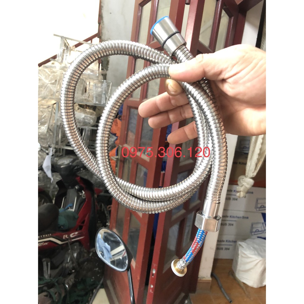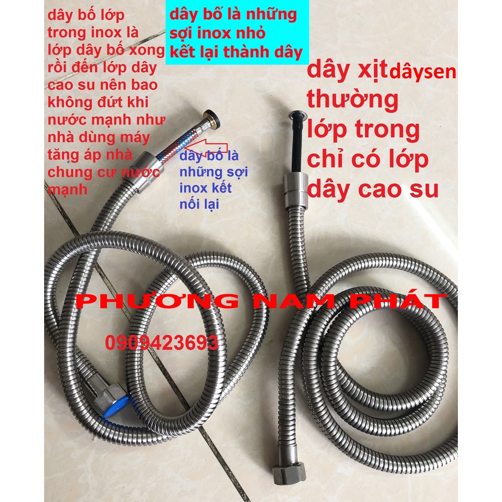 Dây XỊT BỐ 3 LỚP BAO KHÔNG DỨT XOẮN INOX 304Vừa tất cả đầu xịt nhựa, inox đều vừa hết, dây này là loai tốt nhất, 3 lớp, lớp trong cao su, lớp ngoài dây bố là gồm những sợi inox nhỏ kết thành sợi dây bố, lớp ngoài cùng dây inox