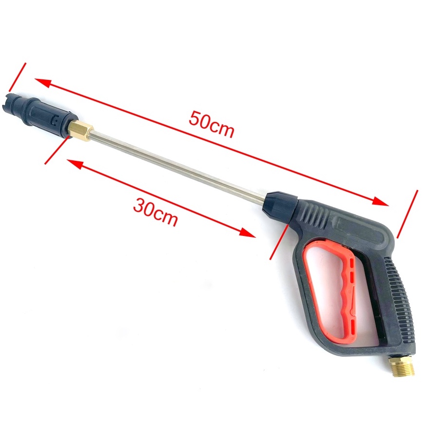 - Ống nối dài có chiều dài lên tới 30cm giúp bạn dễ dàng luôn sâu vào các vị trí khó với tới & tạo 1 khoảng cách nhất định giữa người sử dụng máy bơm xịt rửa xe với vật cần rửa để tránh bắn nước & đảm bảo an toàn hơn