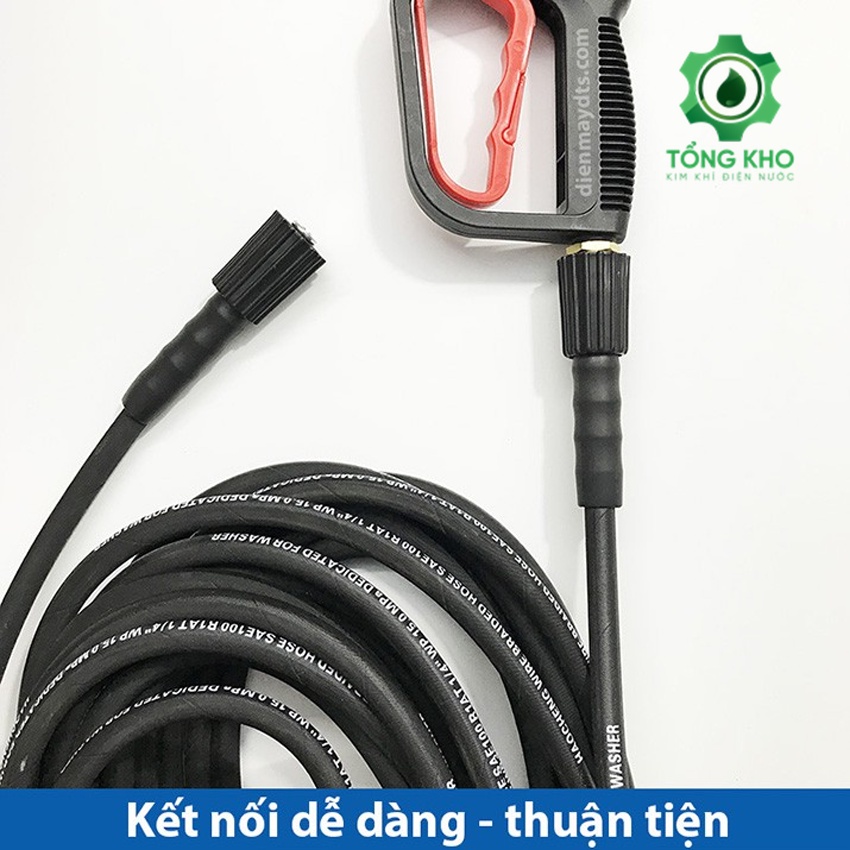 - Dây rửa xe lõi thép được thiết kế hai đầu giúp việc bấm sẵn cút nối nhanh vào máy và súng xịt rửa.