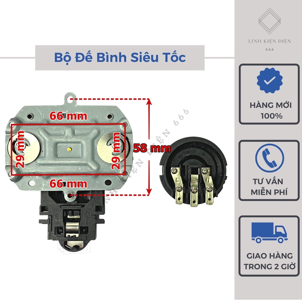 - Hiện tại trên thị trường có rất nhiều loại Đế Ấm Siêu Tốc ( Chân Đế Bình Siêu Tốc). Chính bởi vậy người dùng thay thế cần chú ý một số thông số kích thước bắt vít của các loại Đế Bình Siêu Tốc.