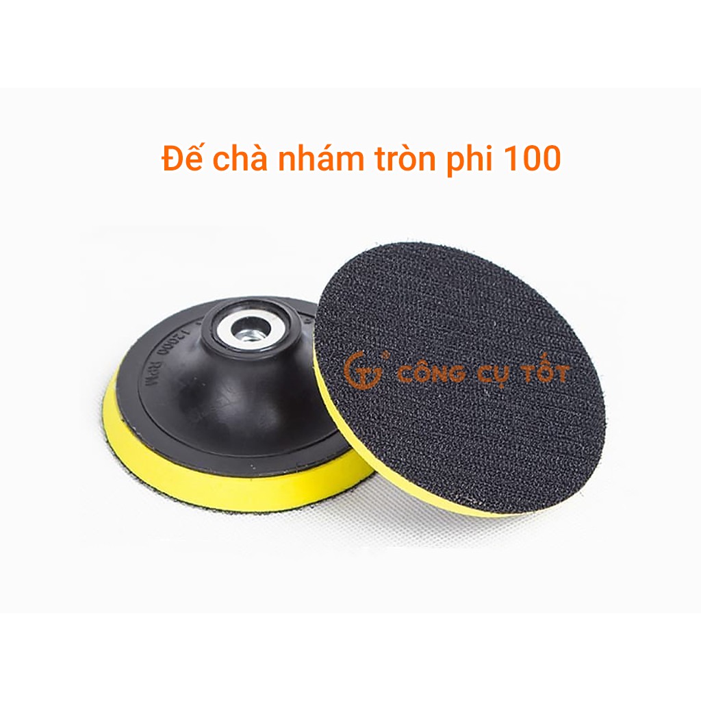 Đế chà nhám tròn Φ100mm là phụ kiện hữu ích tương thích với nhiều dòng máy mài trên thị trường hiện nay. Sản phẩm bền bỉ, có độ dính cao, thích hợp để dính các loại giấy nhám, giấy chà, miếng đánh bóng đường kính 100mm.Đế chà nhám cấu tạo thông minh, bền bỉ, bề mặt có khả năng bám dính cao