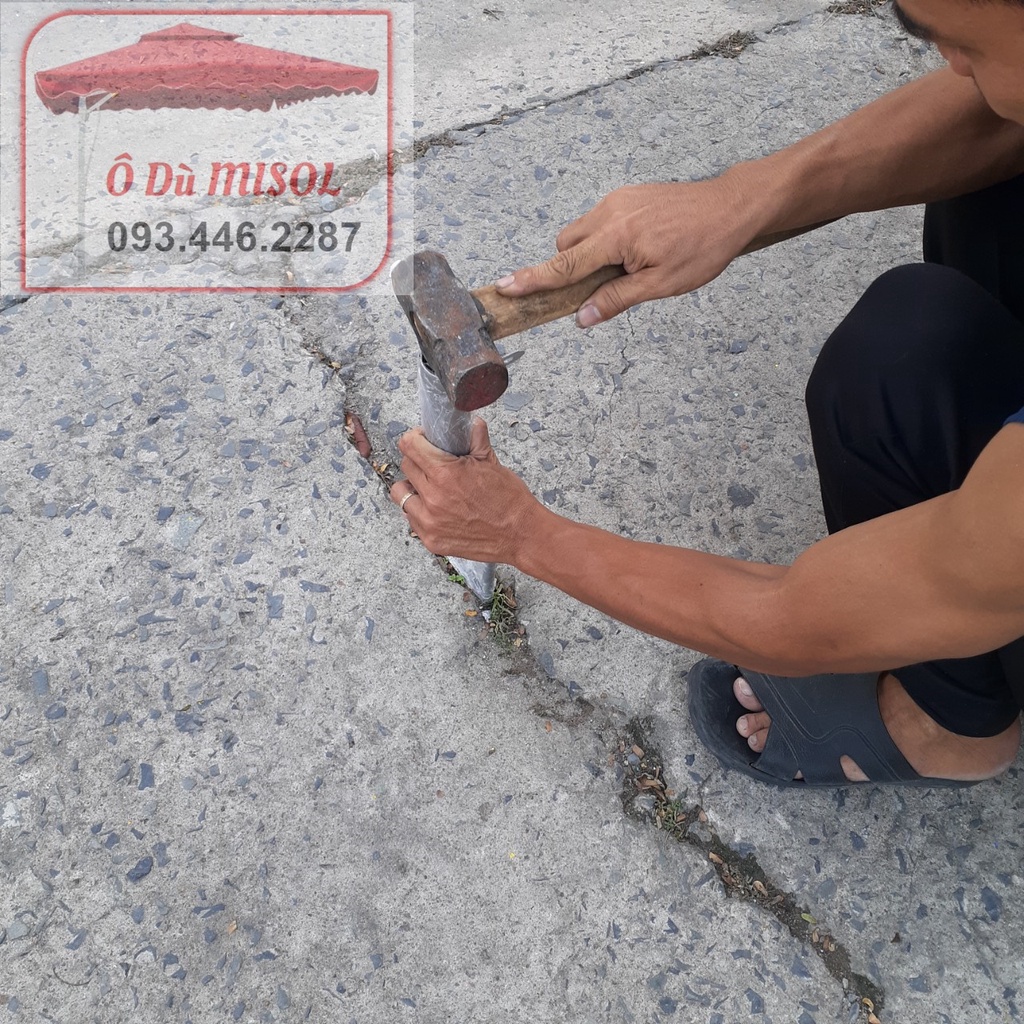 đế dù hàng sắt đặc chắc chắn, chịu được búa như hình, chân đế cắm xuống mặt đất nối với cây dù nhanh gọnTiện lợi, nhẹ có thể mang theo dễ dàng