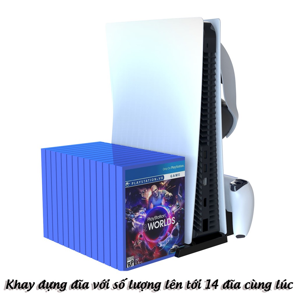 - Sản phẩm tích hợp chân đế dựng đứng cho máy PS5 , tích hợp khả năng sạc cùng lúc 2 tay cầm, và khay đĩa