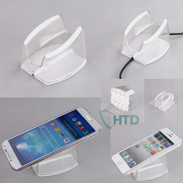 Đế mica trưng bày điện thoại, chân đế mica trưng bày điện thoại, kết hợp bộ chống trôm trung tâm cho điện thoại trưng bày tại các cửa hàng siêu thị điện máy.