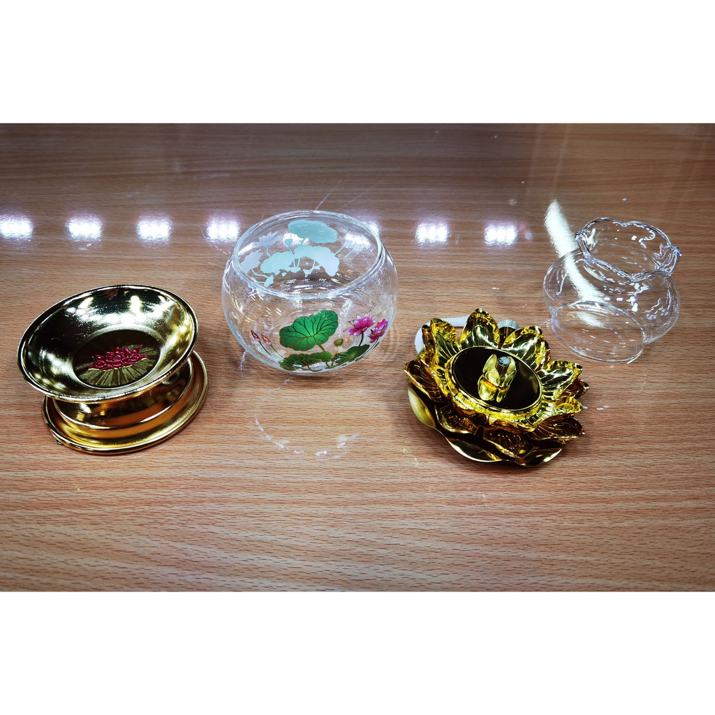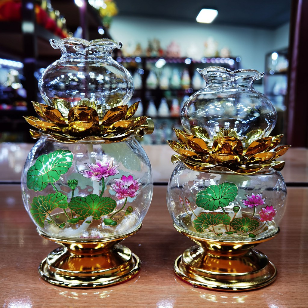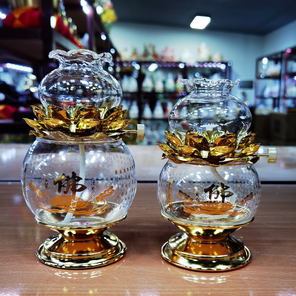 Đèn Dầu Thuỷ Tinh Hoa Văn Hình Sen , Chữ Kinh , Chiêu Tài Tấn Bảo (Vật Phẩm Phong Thủy) - Phật Giáo Tường Thuận