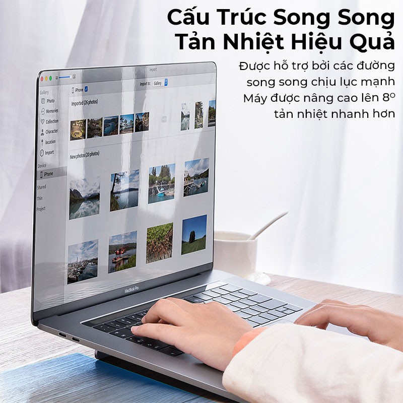 💎 Đế tản nhiệt siêu mỏng Baseus Papery Notebook Holder có thiết kế dạng bản lề vô cùng thông minh và tiện dụng có thể đóng/ mở tiện dụng . Khi mở ra có tác dụng tăng hiệu quả thoát nhiệt cho đế Laptop/ Macbook , thay đổi góc nghiên của bàn phím và màn hình so với mặt bàn khoảng 8 độ giúp cho thao tác sử dụng và ghỏ phím được thuận tiện và thoải mái hơn . Giảm thiểu tiếp xúc giữa đế máy và mặt bàn giúp hạn chế trầy xước thân máy .