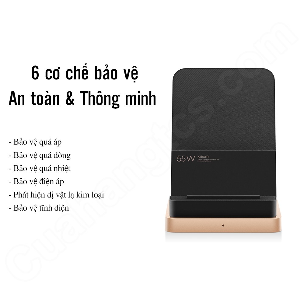 - 6 cơ chế bảo vệ an toàn, thông minh như quá áp, quá dòng, quá nhiệt, chống tĩnh điện, phát hiện dị vật, bảo vệ điện áp cũng được tích hợp đầy đủ trên chiếc đế sạc không dây này. Từ đó người dùng có thể yên tâm về an toàn cho thiết bị trong suốt quá trình sạc.