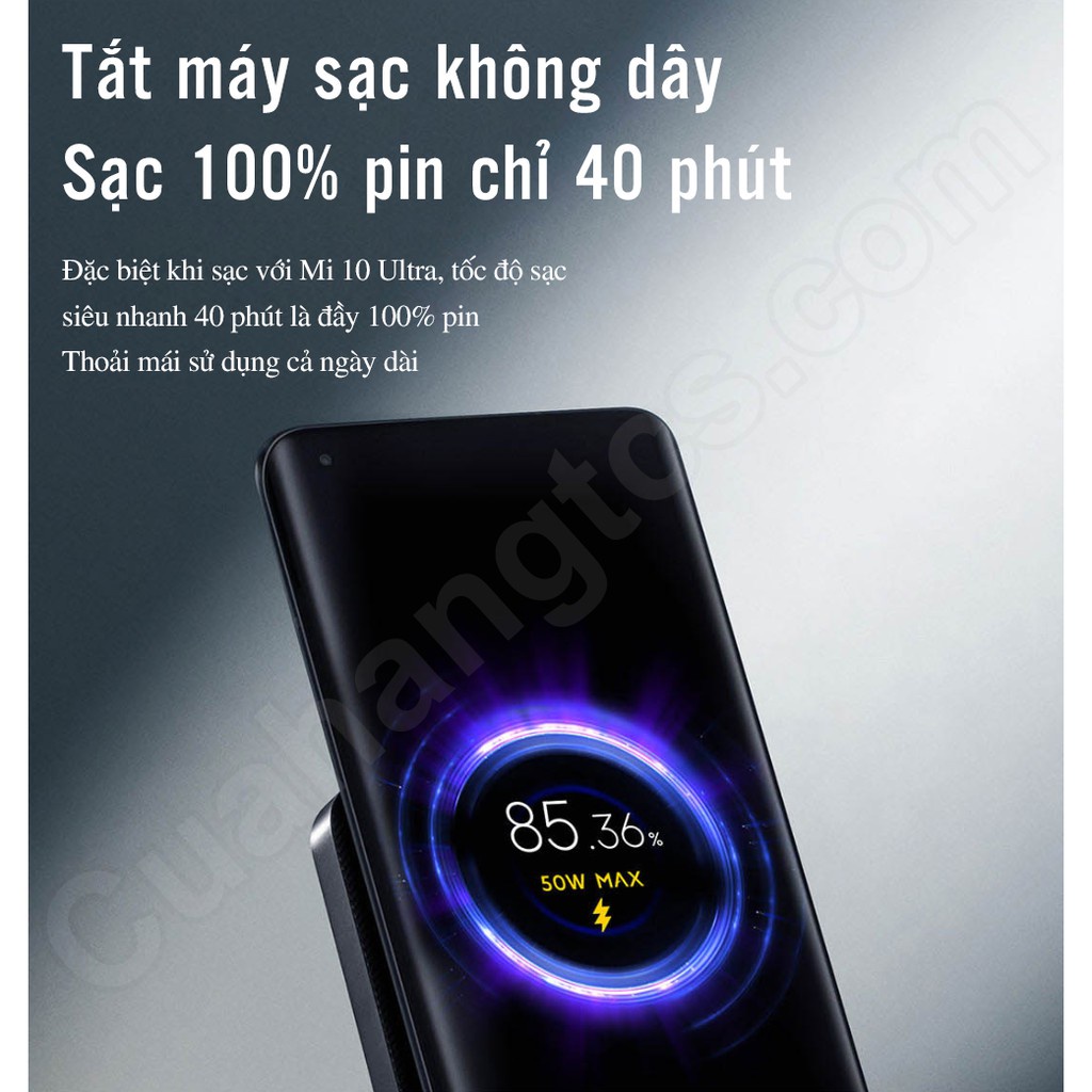 - Đế sạc không dây Xiaomi MDY-12-EN cung cấp đầu ra tối đa lên đến 55W, cung cấp dòng sạc ổn định, sạc nhanh nhất 100% trong 40 phút khi sạc không dây cho Mi 10.