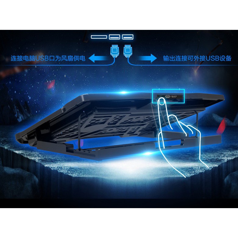 2 Cổng giao diện USB: ở trên cùng ở giữa sản phẩm là hai giao diện USB và núm bật tặt công tắc quạt, ở dưới cùng của thiết kế được áp dụng các miếng chống trượt, bề mặt tăng tốc độ hiển thị cho laptop, dễ sử dụng và an toàn.