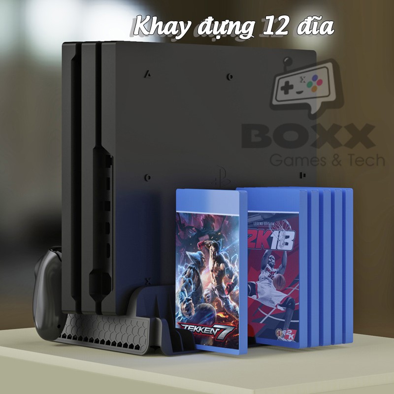 - Sản phẩm tích hợp chân đế dựng đứng cho máy PS4 , tích hợp khả năng sạc cùng lúc 2 tay cầm, và khay đĩa cho khả năng cất được 12 đĩa cùng lúc.